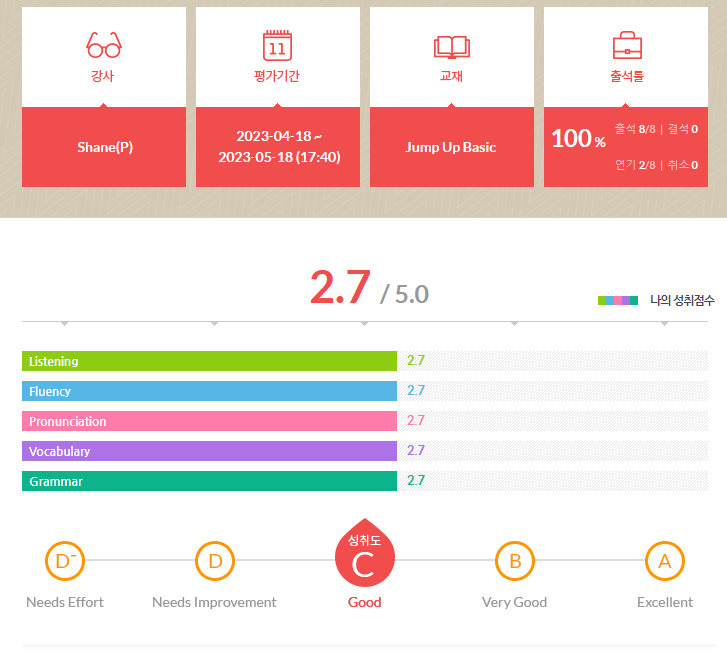 친절하게 ET폰에서는 매 월 수강자의 월별 평가서를 보내주십니다. 5점 만점에 몇 점인지 성취도를 수치화해서 표시해주시고, 잘한 점과 부...