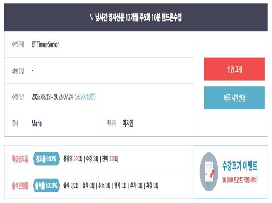 안녕하세요! 벌써 한 달이 지나서 또 수강 후기를 남기러 왔습니다! 저는 제작년 3월 대학교 신입생이 되었을 때부터 이티폰으로 주 2회 10분 영어수업을 듣기 시작했는데요 벌써 2년이 훌쩍 ...