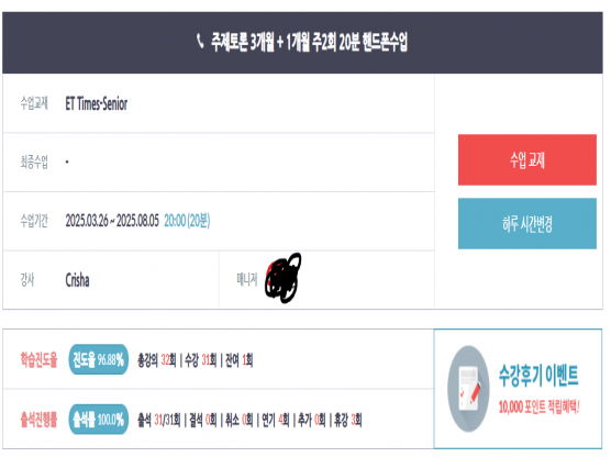 한달동안도 이티폰과 함께하며 영어수업을 놓치않으려 노력한 한달이었습니다.7월에는 선생님의 일정으로 인해 잠시 다른 선생님과 수업을 진행하게 되었지만, 결국 저와 가장 오랜 시간 ...