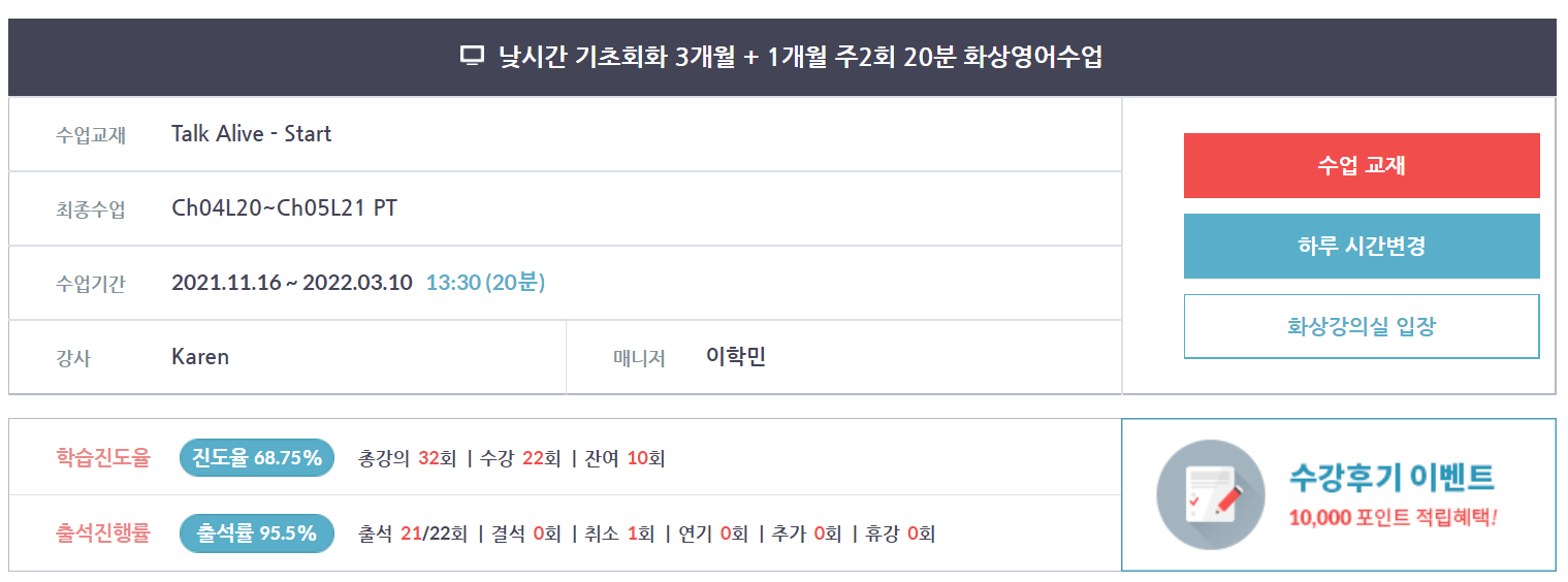 저는 처음에 Talk alive교재로 시작해서 보아뉴스를 잠깐 했다가, 프리토킹 교재로 주5회 10분씩 하고 있는데요, 사실 가장 큰 장점은 하루시간변경인거같아요. 매일 같은 시간에 10분씩 전...