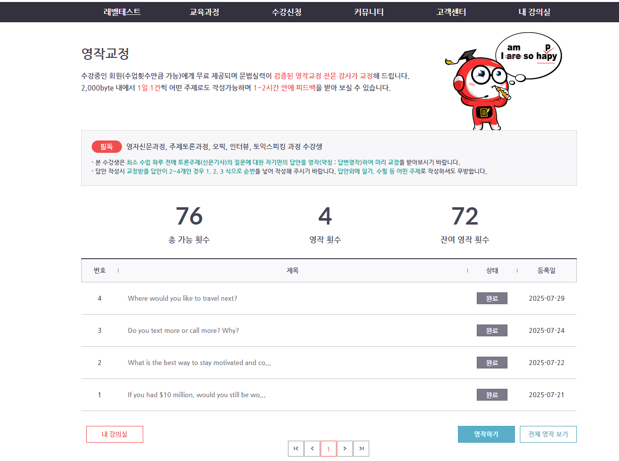 안녕하세요. 처음 시작할때는 호기롭게 3개월만 하면 영어실력이 눈에 띄게 향상 될 것을 기대하고, 자신만만하게 수업을 들었지만..월 평가 피드백을 보면 실력은 크게 나아지지 않았다는...