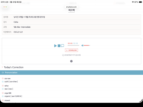 안녕하세요. 화상영어 수업 시작한지 3개월 후에는 1년이 됩니다. 1년이 지난 시점에 얼마나 성장해 있을지 기대 됩니다. 물론 걱정도 있구요. 수강중인 수업: Talk Alive - Intermediate...