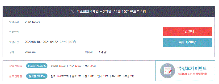 이티폰 Cherlyn Teacher 전화영어 3개월에 대한 후기 입니다.매일 10분 동안 Talk Alive-Start 교재를 사용하여 벌써 막바지에 달했네요.영어 회화를 잘 하고 싶어서 전화영어를 찾다...