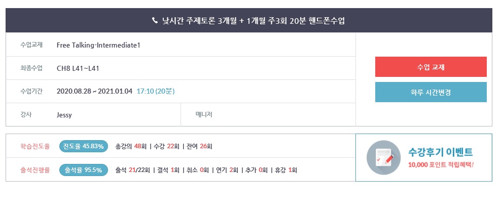 안녕하세요? 두 번째 수강후기를 남기게 되었습니다. 월, 수, 금 주3회씩 10분 해왔는데, 이번에 재수강을 하게 되었네요. 전화영어의 장점은 무엇보다 꾸준히 영어 말하기가 습관화 된다는...
