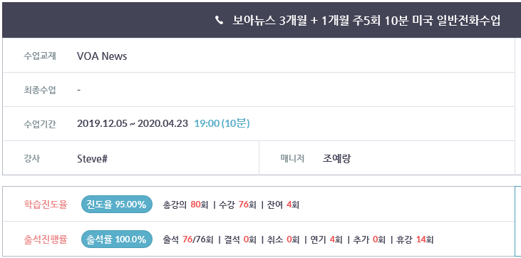 보통 4개월 간격으로 수업을 연장하는데이번엔 코로나 때문에 휴강 많이 했음에도 시간이 금방 가는 것 같습니다.원래강사님의 사정으로 중간에 새로운 강사님인 Steve강사님으로 교체...