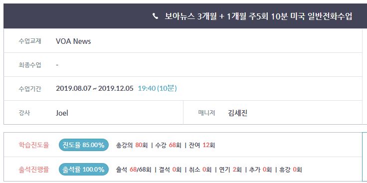 2018년 3월부터 이티폰에서 수강 시작했는데3번째 재수강 코스도 벌써 끝나가네요~!현재는 VOA 뉴스를 진행하고 있는데매일매일 새로운 주제로 대화하니까재미도 있고 다양한 분야의 영...