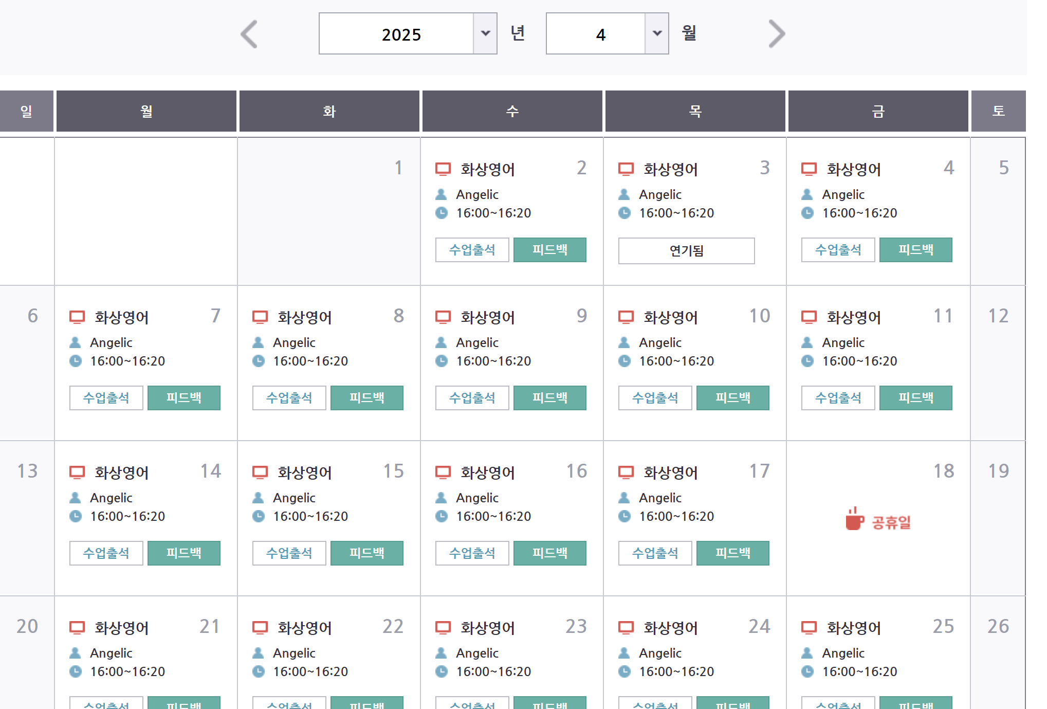 이번이 두번째 수강인데 정말 만족 하면서 하고 있습니다. 저를 가르쳐 주시고 계시는 Angelic 쌤이 너무 열정적이시고 정말 활기차게 가르쳐 주셔서 정말 행복하게 하고 있습니다.지금 ...