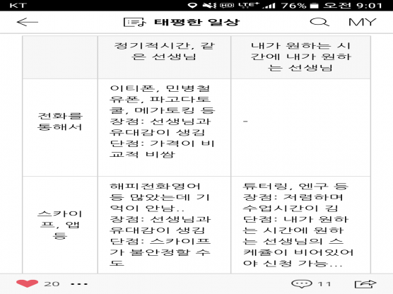 영어와 담을 쌓고 산지 10년이 지났는데 올해 시간 여유도 있어서 영어 공부 방법을 고민하다가 이티폰을 알게 되었습니다~타업체 화상강의와 꼼꼼히 비교해보니 이티폰만한 게 없더라구요~가격도...