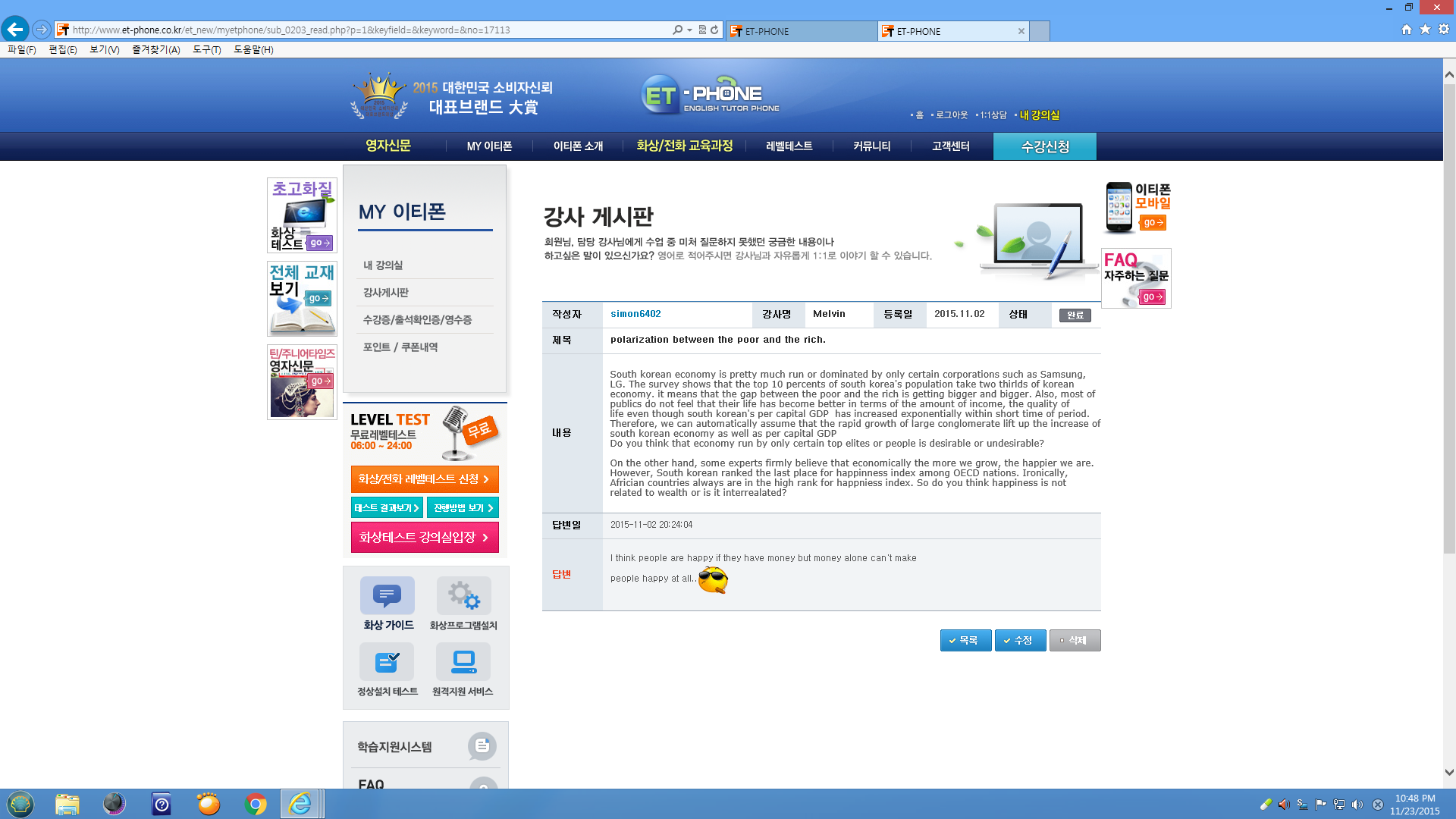 이티폰을 시작한지 어느덧 2년이 되어가네요.회사에서 막상 회사에 취직하고나면 점수용 영어가 아니라 실제로 사용할수 있는 영어가 필요합니다.그래서 영어회화학원도 꽤 오랫동안 다녔...