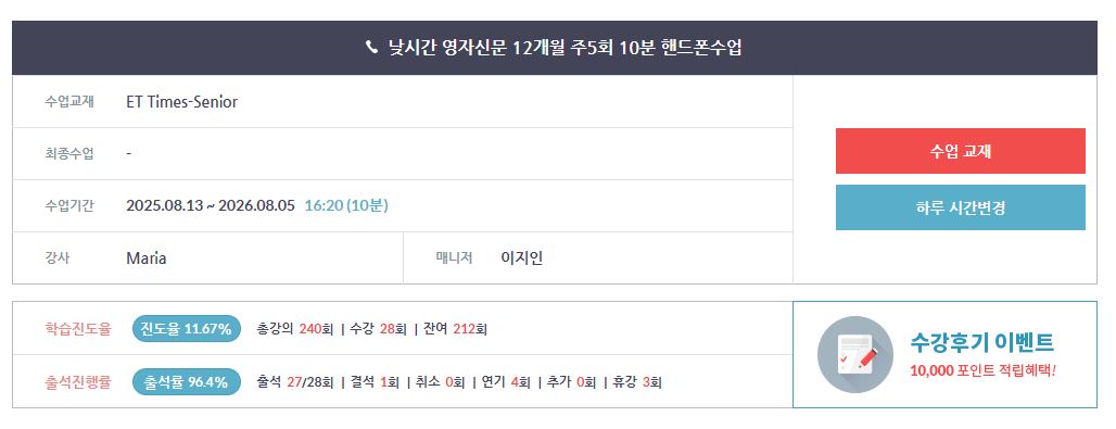 영어와 담을 쌓고 산지 10년이 지났는데 올해 시간 여유도 있어서 영어 공부 방법을 고민하다가 이티폰을 알게 되었습니다~타업체 화상강의와 꼼꼼히 비교해보니 이티폰만한 게 없더라구요~가격도...