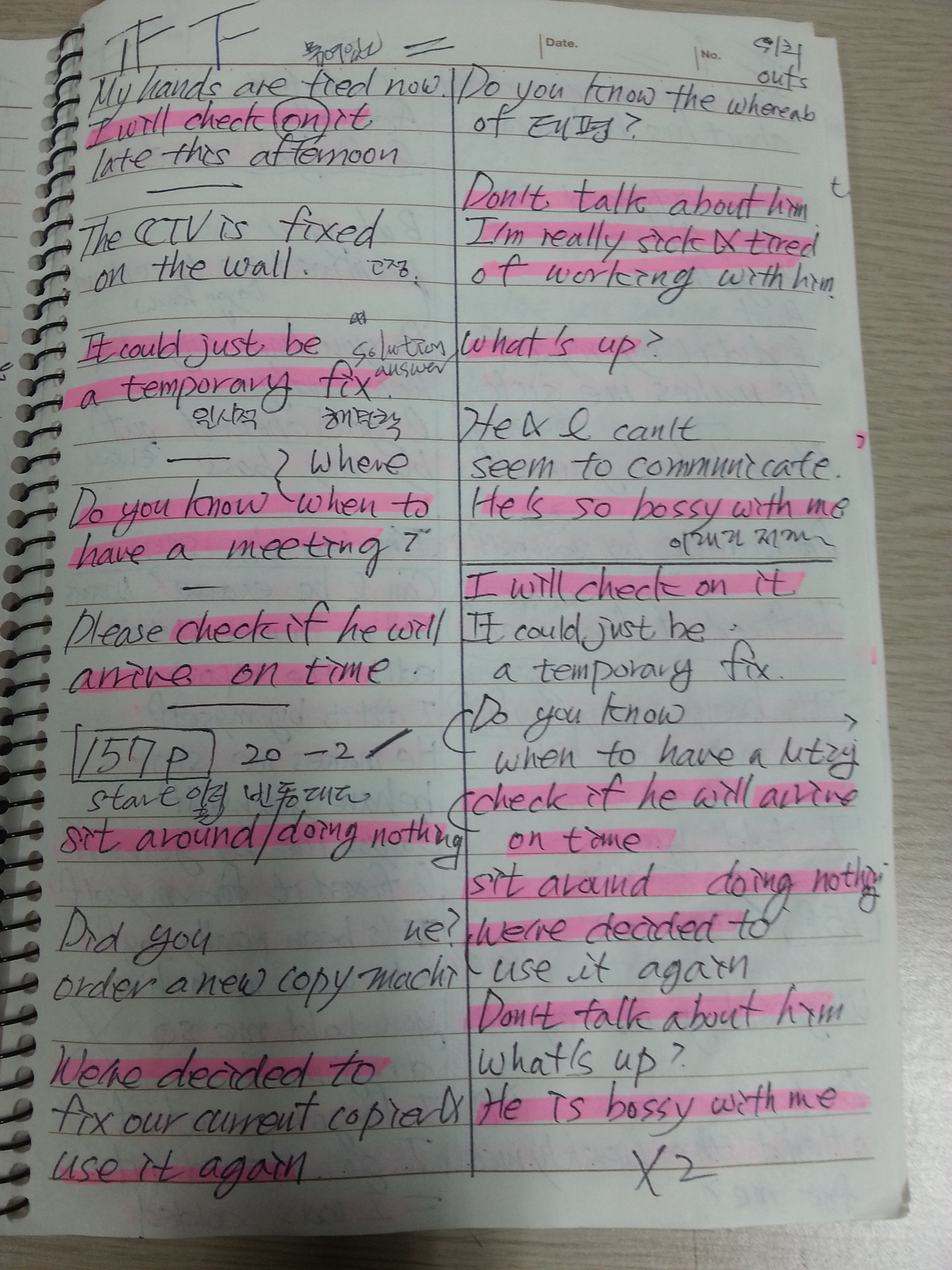 스피킹을 위해서 노트를 만들고 활용한지 약 2년 정도가 되어 가는 것 같습니다.노트정리패턴이 계속 바뀌어 오다가 최근에 저에 맞게 정착되어 공유하고자 합니다.좋은 문장들을 외우고 ...