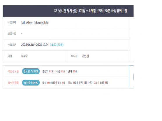 시작이 반이라고 벌써 수강을 한 지 3달이 지났네요. 매일 저녁 하루를 마치기 전에 하루 20분 수업을 하는 것이 이제는 제 생활의 일부가 되었습니다. 마침 제 강사님이 제 나이와 같아...