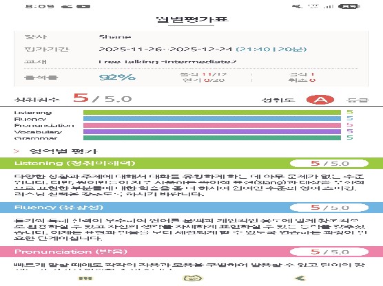 이번에도 역시나 연장할 생각 백프로! 쌤들도 너무 친절하시고 서투르게 질문해도 전부 잘 유추하셔서 다정하게 답변해주세요 ㅎㅎ 원래는 영어로 대화를 할 때 틀릴까봐 머뭇거리는 습관...