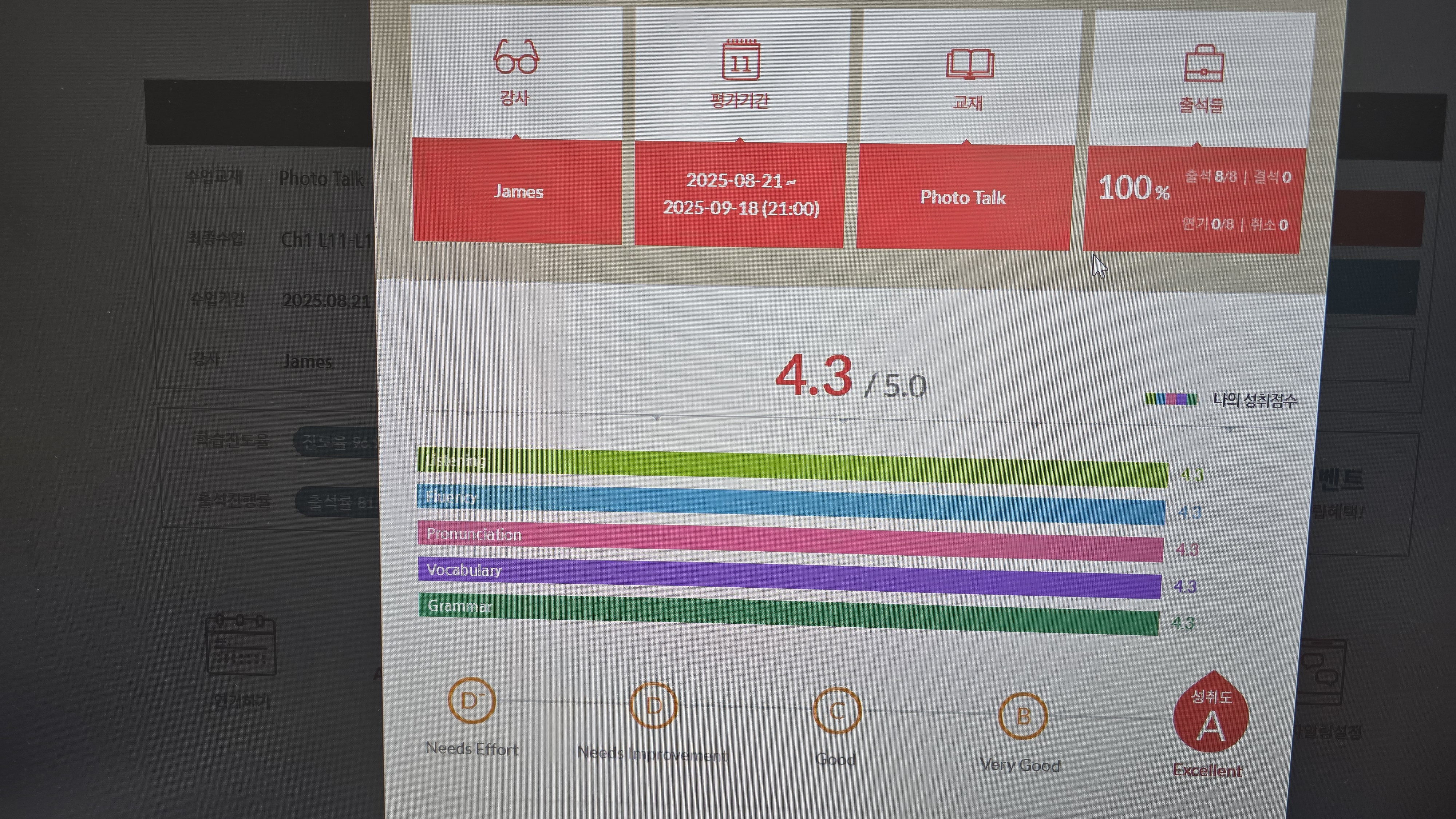 한 번에 오래하지는 않지만 그동안 나름 꾸준하게 20분씩 해왔습니다. James 선생님과 아이의 코드가 잘 맞고, 지치지 않고 성실하게 서로 교수-학습 활동을 한다면 지속적으로 꾸준한 ...