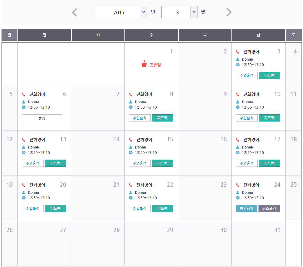 다른 분 후기를 좀 봤는데.. 저는 하루 시간 변경이 별로 큰 효용이 없더라구요. 일단 다른 선생님을 만나는 걸 별로 안 좋아해서 (또 자기 소개하고 ice-breaking 하느라 시간을 쓸 것 같아서..) Donna 선생님 하려고 하면 이 분이 너무 인기가 많아서인지 빈 시간이 별로 없더라구요. 그 부분이 조금 아쉬운데.. 좋은 선생님과 하니까 생기는 어쩔 수 없는 문제 같습니다. ㅜ.ㅜ