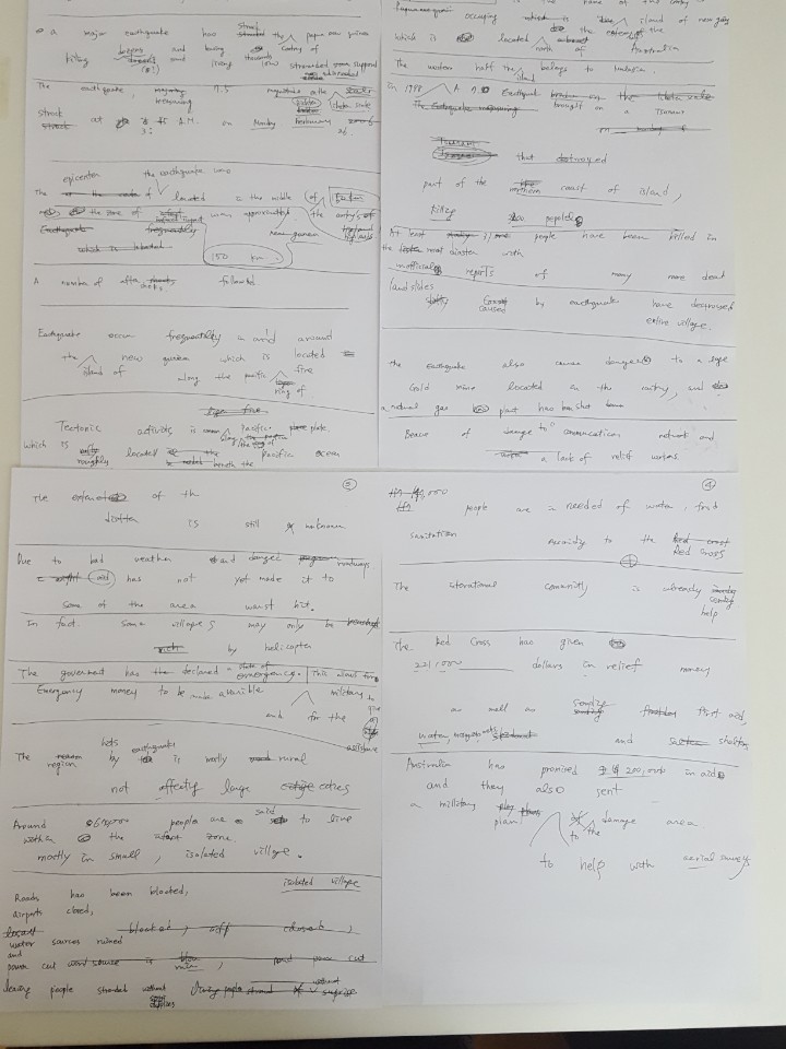 처음에는 쭉 --들으면서 들리는 것만 받아적는데 음원파일을 5번 정도 반복해서 듣게 됩니다.