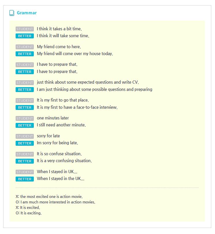 그리고.. 이티폰은 수업 뿐만 아니라 제공해주는 것들이 참 많은 것 같아요. 내가 공부하고자 하는 의지만 있다면 많은 걸 제공해주는 곳이랄까?? 특히 가끔 영작이 필요한 경우가 있었는데 교정해주는 서비스가 있어서 참 유용했습니다. 시간 많으신 분들은 매일매일 일기나 에세이를 써서 주기적으로 피드백 받는 것도 참 도움이 될 것 같아요. 또 런 앤 스피크 표현들도 재밌어서 한 번 클릭했다가 수십 개 읽어버렸네요 매일매일 꾸준히 하면 정말 피가 되고 살이 될 것 같은 표현들이에요! 다음 달부터는 저도 정말 마음 다잡고 이런 부가 서비스까지 알뜰히 챙기면서 영어공부 열심히 하려고 합니다!