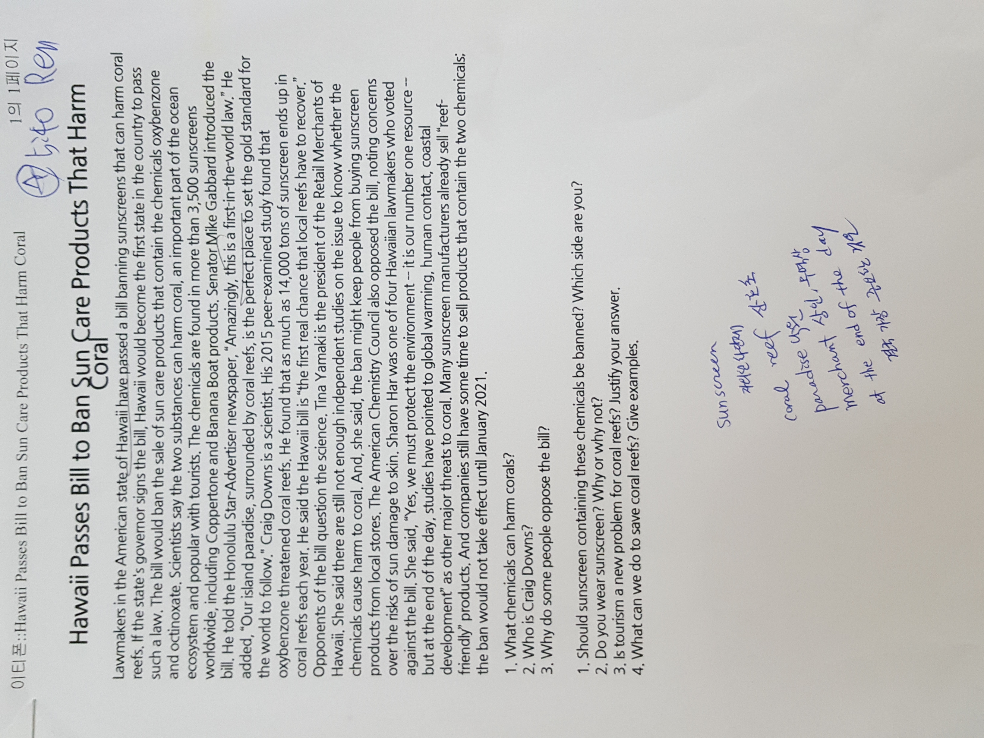 특히 새로운 단어들을 많이 알게 됩니다. 그냥 일반회화만 하면 늘 쓰던 단어만 쓰게 마련인데...보아뉴스를 하면 각 분야의 전문 용어들을 많이 알게 됩니다. 미국 현지에서 쓰는 문어체에 익숙해지는 것도 도움이지요. 저는 그날그날의 보아튜스 교재를 프린트해서 우선 사진처럼 워드팀에 제시된 뜻을 종이에 적습니다. 그리고 문장을 오디오 들으며 쭉 읽고 중심 줄거리를 파악하지요. 시간이 많을때에는 들으면서 곧바로 따라하는 받아쓰기를 하기도 합니다. 읽어주는 속도가 그렇게 빠르지는 않아서 할만합니다. 물론 손으로 쓰는 속도가 느려서 여러번 반복해사 전체 문장을 모두 받아쓸 수 있습니다. 시간만 된다면 들으며 받아쓰며 학습하는 것이 가장 도움이 많이 되는 것 같습니다. 시간이 없어서 그냥 쭉 읽고 수업을 하면 내용이 머리에 남아있지 않고 그냥 일반회화수업을 하다가 끊은 셈이 되어버리지요. 미리 시간을 내서 뉴스 기사를 쭉 훑고 잘 익힌 후 전화영어를 하면 ㅁ기사속의 단어를 사용하는 기회도 생기고 복습을 철저히 하게 되는 셈입니다.