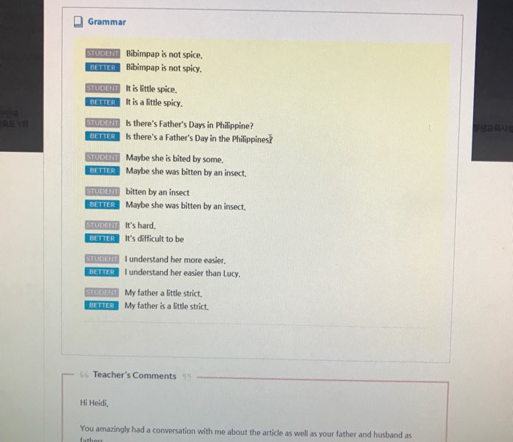 네 심은정 님^^ 자녀분들과 같이 수업하시는 분이시네요. 영어동화 및 영화 등 영어 동영상물 보면서 이티폰 수업을 병행하고 있으시다니 리스닝과 스피킹을 동시에 공부하고 계시네요. 원어민 강사와 1:1로 수업하면서 매일 예습, 복습을 꾸준히 한다면 확실히 실력 향상에 도움이 많이 되실 것으로 보이며 외국인과 만나서도 자연스럽고 자신감 있게 이야기할 수 있으리라 생각됩니다. 앞으로도 열심히 공부하시길 부탁드리며 감사의 마음으로 수강후기 포인트 적립해드렸습니다. 파이팅!!