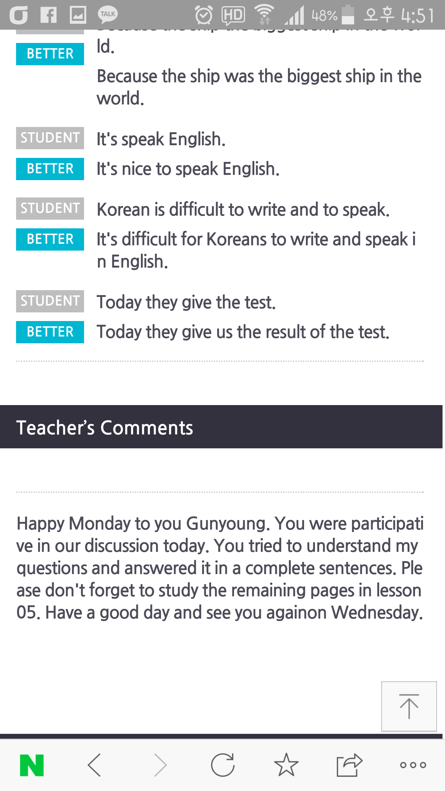 제가 첨부하는 피드백은 사실 저희 자녀가 공부를 다 마치고 리뷰하는 부분인데 리뷰는 한주간 했던 공부를 피드백 하는건데 다시 살펴보지 않고 전화를 받았어요. 저도 항상 체크는 하는데 리뷰니까 그냥 해봐 했는데 선생님께서는 그런 세세한것도 아시고 공부하라고 코멘트 달아주시기 까지 하고 통화 내용에서도 저희 아이에게 공부 했었니? 라고 물어보셨습니다. 당연 저희 아이는 안했으니 안했다고 이야기했고 오히려 코멘트를 좋은 이야기만 하시는 분들도 있을텐데 사실대로 써주시니 더욱 안심이 되어 수강후기를 올릴 때 첨부합니다. 조금 부끄럽긴 하지만 다음부터는 꼬옥 리뷰파트 부분도 공부를 시켜야겠다고 생각했어요. 이티폰을 시작한지는 짧지만 선생님과도 좋은 관계로 지내게되어서 기쁘고 앞으로도 꾸준히 같이 공부하고 싶어요.
