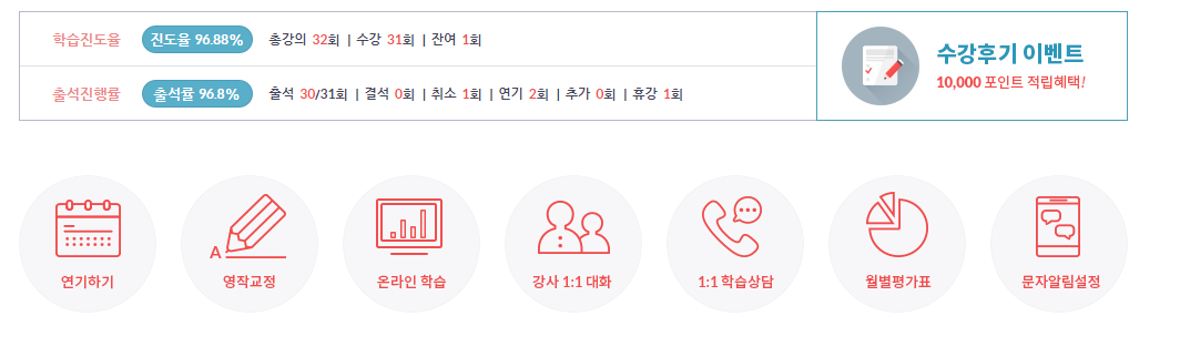 네 이서희회원님, 이티폰 서비스에 만족하신다니매니저로서 정말 기쁩니다. 면접 수업도 꼭 만족하실꺼예요. 성인들의 경우 하루 10~20분이 짧은 시간이라 소흘하기 쉬워 결석, 취소가 많아 효과를 얻지 못한다 생각하시는 경우가 많으나 꾸준히 하신다면 실력향상에 분명히 많은 도움 받으실수 있으실겁니다. 회원님 말씀처럼 꾸준히 하는게 가장 중요해요! 수업전 영작교정과 수업 후 올려지는 피드백도 활용해 보세요~ 다음 수업후 올려질 수강후기도 기대하며 포인트 지급해드립니다.