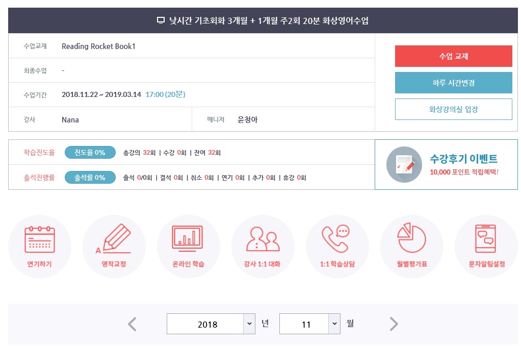 수업시 아이의 실력이 조금씩이지만 지속적으로 향상이 되어감에 따라 아이에게 칭찬도 격려도 많이좀 해주시길 부탁드리고, 대화시 사용하시는 단어어휘 문장등도