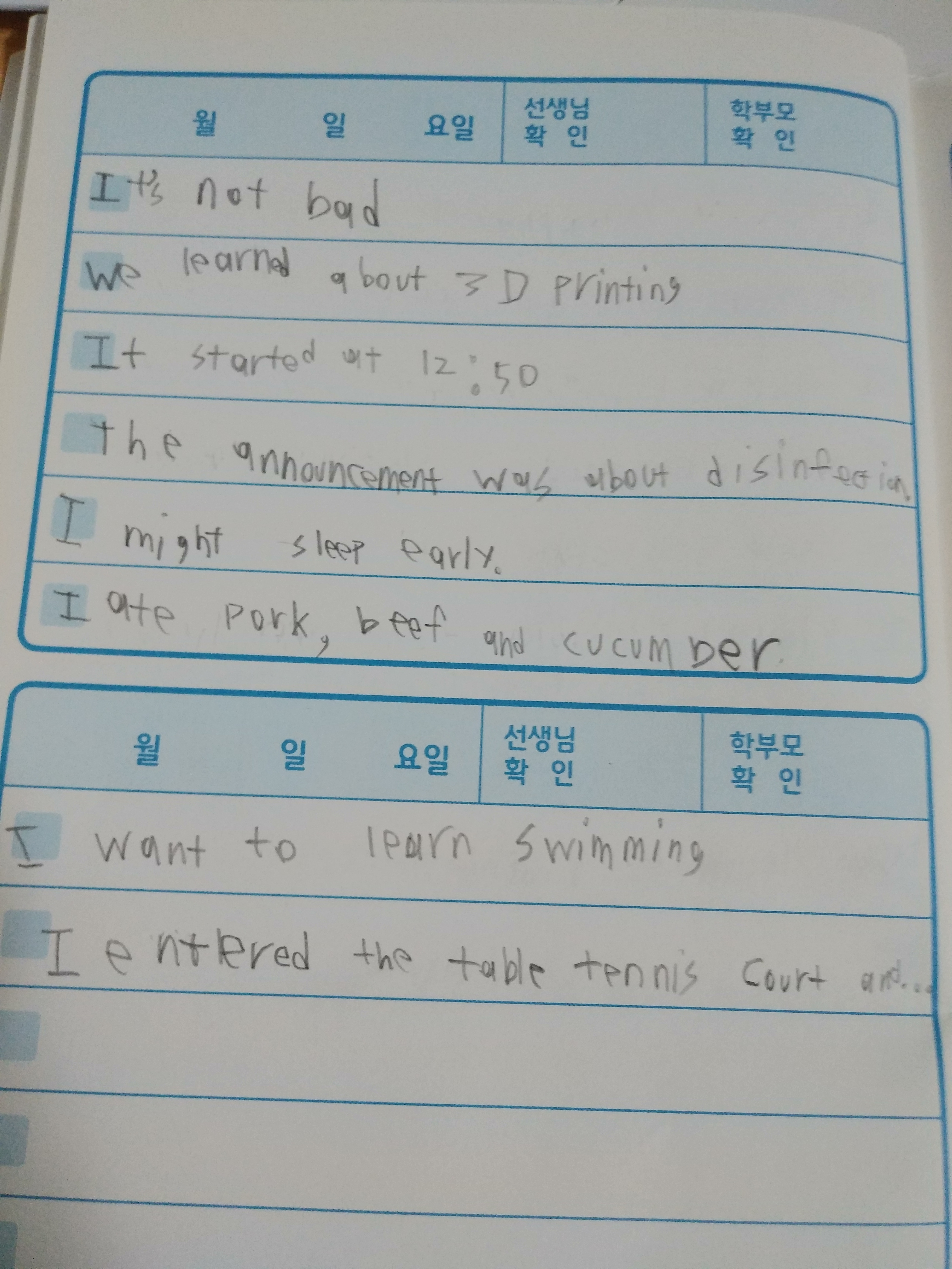 그 후로 벌써 4개월정도가 지났네요~ 우선 이티폰의 장점은 시간변경이 자유롭다는 것, 그리고 바로 도착하는 피드백~저희아이는 피드백을 직접 쓰고 3번씩 읽어보기도 합니다(위 사진이 아이가 선생님의 피드백을 적은 내용인데요. 매일 쓰다보니 처음에는 힘들어 하던 영어 문장 쓰기도 잘하네요~)그래서인지 틀린 문장이 조금씩 고쳐지는 것 같아요~마지막으로 선생님들이 문법과 발음을 알려 주시니 아이가 바로바로 교정할 수 있어서 좋더라고요~