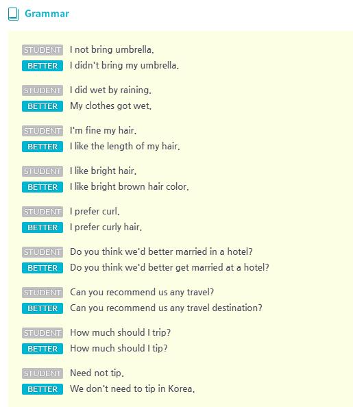 그리고 제가 못알아 들을때에는 Len은 항상 제가 이해할때까지 설명을 두번이고 세번이고 계속 해줍니다. 반대로 제가 말하고 Len이 잘 이해를 못할때에는 다시 질문으로 제 말을 바른 답으로 이끌어 줍니다. 그리고 마지막으로 다시한번 저의 틀린 회화문법을 수정 해 주면서 저는 그 문장을 따라 읽게 됩니다.