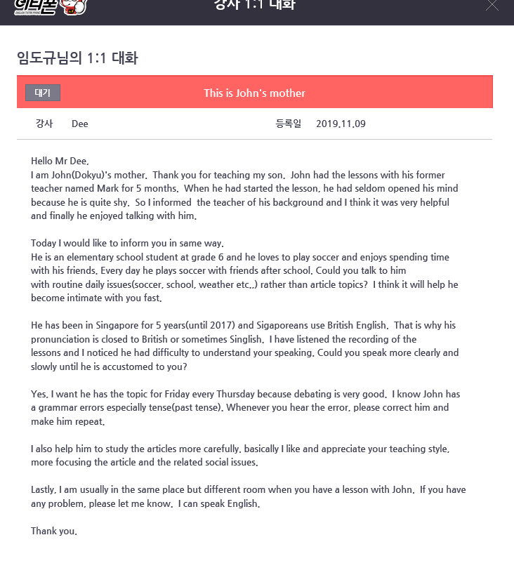 하지만 이번 강사님도 엄마인 제가 녹음 내용을 들어보니 아주 학구적이고 열정이 가득한 분인 것 같더라고요. 그래서 처음 조율하는데 필요한 내용을 먼저 강사님과 했던 것처럼 강사와의 1:1 상담으로 적어봤습니다. 부디 자리를 잘 잡기는 바래야죠. 그때까지만 제가 신경쓰고, 한달 후면 신경 안써도 아주 잘 할 거라고 생각합니다.