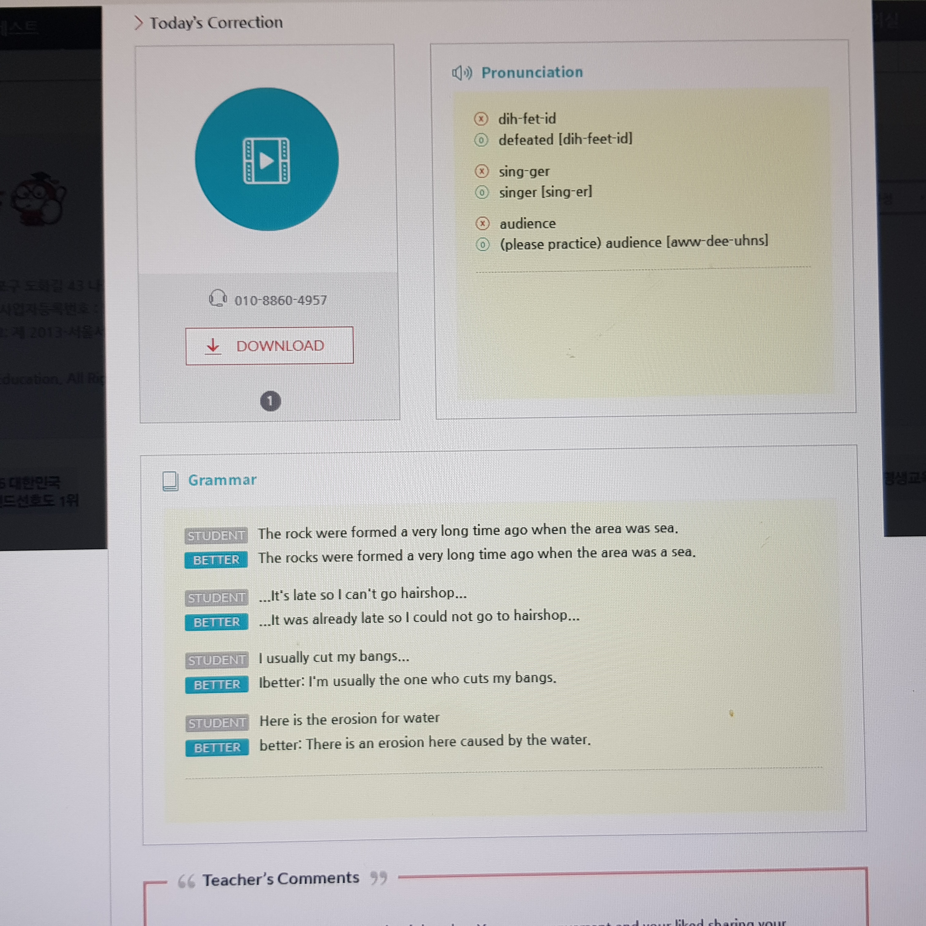 선생님이 제가 수업할 때 잘못 발음한 것, 더 좋은 어휘 등으로 고쳐줍니다.
