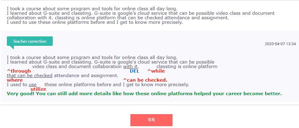 이번달에는 다른 일정 때문에 재수강은 주3회 20분 수업으로 바꿨어요. 사실 첫달 수업을 하면서 중간중간 잘 알아듣지 못하는 대화들도 있었는데, 그냥 슥 넘어가고 얼버무리는 경우도 많았어요. 위의 사진처럼 수업 후 발음과 문법 상의 실수를 알려주는데 , 항상 비슷한 부분에서 실수가 많은 것도 느꼈어요. 그래서 이번 달에는 녹음본을 차근차근 들으면서 제가 자주 하는 실수를 찾아 고치는 것이 목표입니다.