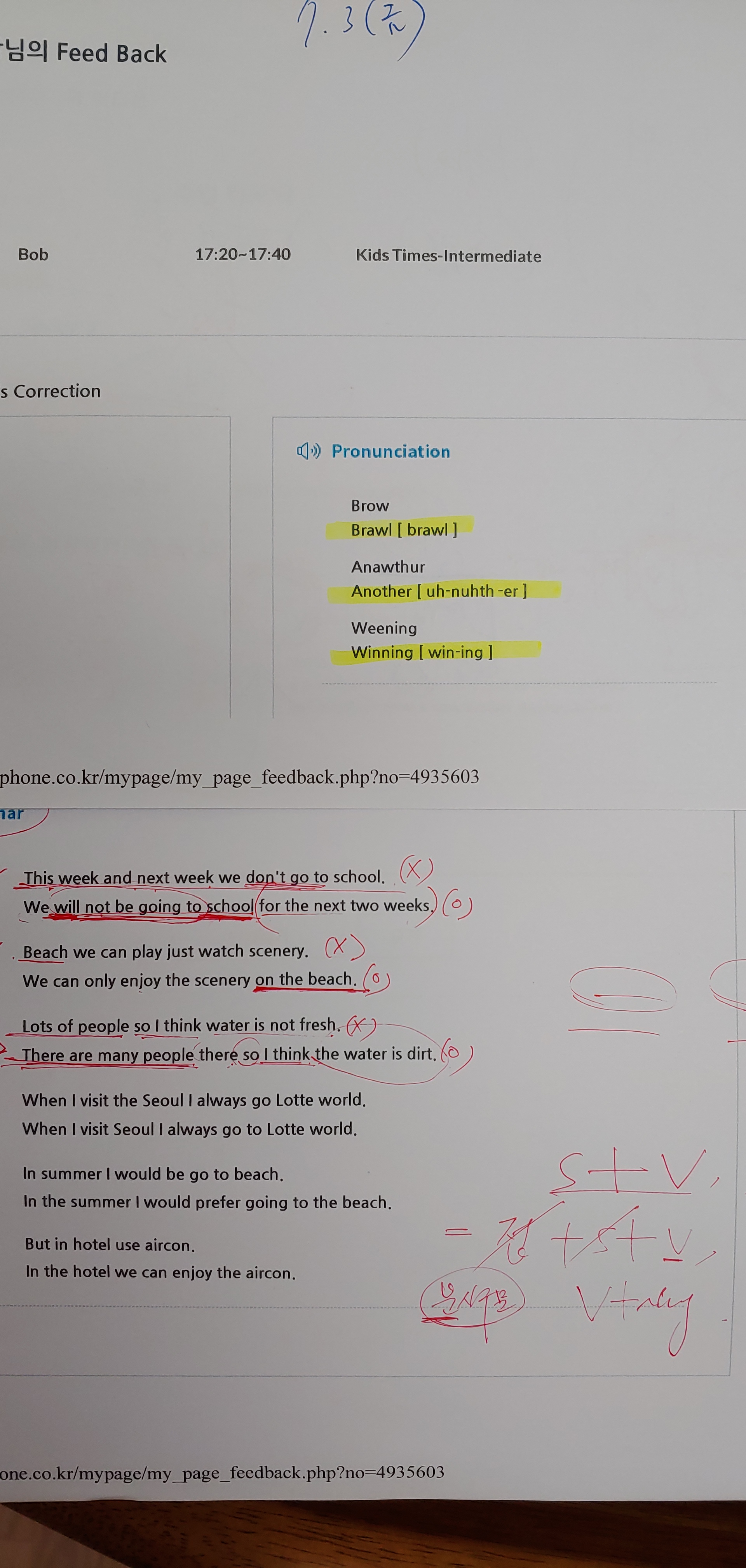 영미 선생님과 주 3회 20분씩 수업을 하다보니, 듣기 실력은 많이 좋아져서 학교, 학원 듣기시험에서는 다 맞는 것 같습니다.
