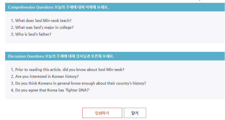매주 올라오는 기사중 관심있는 글을 출력해서 기사 이해 질문부터, 더 생각해 볼 질문에 대해 말할 거리를 준비해서 전화를 받습니다. 어떤 선생님은 기사를 우선 큰소리로 읽게 하면서 발음을 고쳐주기도 하고, 어떤 선생님은 기사 내용을 물어보는 걸로 서두를 시작하십니다. 선생님들마다 티칭 스타일과 노련합이 느껴지는 정도가 다르고요. 지금하고 있는 S 선생님 너무 좋으십니다. 저희가 결석, 연기가 거의 없어서 그런지 다 좋은 선생님만 만나게 되었어요.