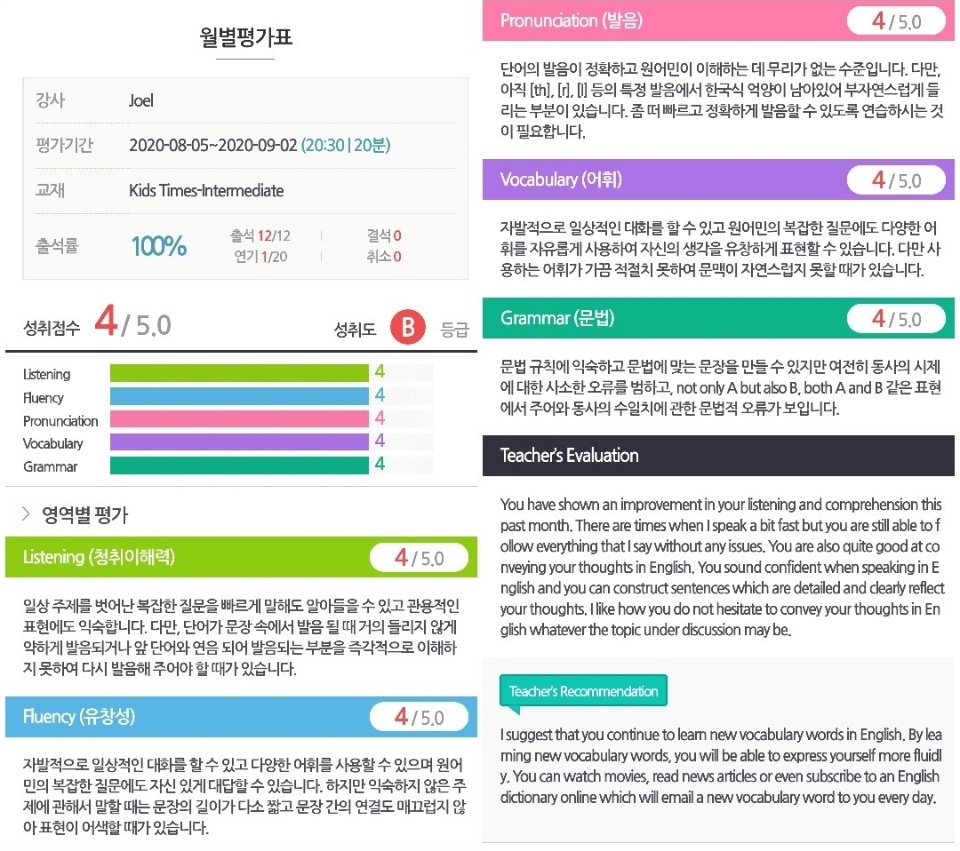 릴 것 같습니다. 하지만 전화영어는 선생님의 목소리만 들으며 하니깐 더 집중해야 알아들 수 있어서 집중도도 올라가고 듣기 훈련도 더 잘 되는 것 같습니다. 매 수업이 끝나면 바로 피드백이 올라오는데 틀린 발음부터 문법 표현까지 다 고쳐주십니다. 그리고 매우 정성스럽게 코멘트도 달아주셔서 수업 종료후에 피드백 읽어보는 것이 또 하나의 낙입니다. 매달 월말 평가표도 올려주시는데 제가 부족한 부분도 알 수 있고 성적이 향상되는 것을 보는 재미도 있습니다. 저는 이티폰 수업에 100퍼센트 만족하고 있고 앞으로도 계속 열심히 이티폰을 할 생각입니다. 감사합니다.