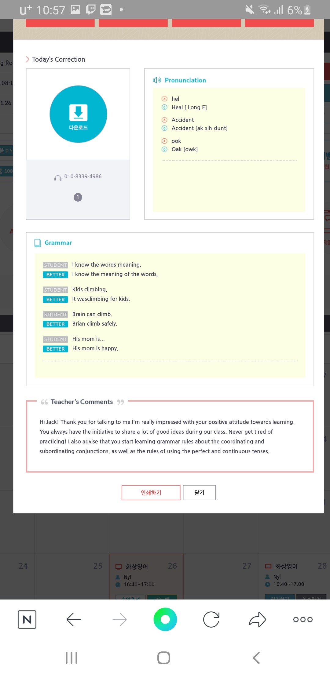 첨에 많이 긴장하고 아직 발음이나 문법,문장을 만드는것등 영어에대한 실력이 모두 완성된건아니지만 선생님의 맞춤설명,피드백,평가표를 보고 복습을하면서 영어가 확실히 부담스러운게 덜 느껴지는것같습니다