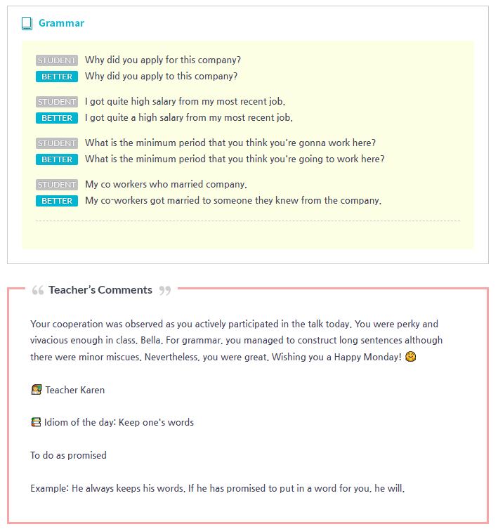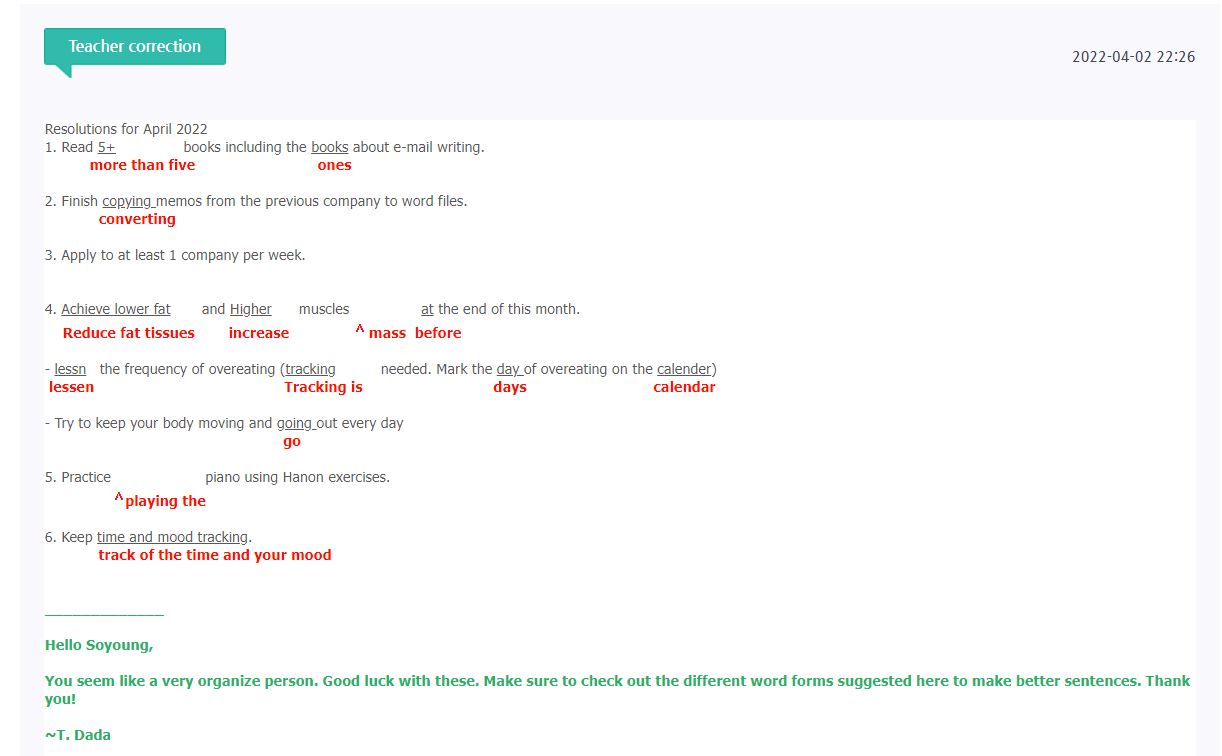 2. 영작교정을 받을 수 있다. 수업 횟수만큼 무료 영작교정을 받을 수 있는 게 좋았습니다. 다른 곳 중에서도 이게 있는 곳이 있지만 가격대가 더 높았어요.