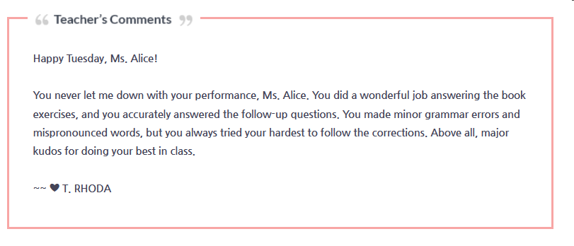 전화로 수업을 하기 전 늘 분위기를 풀며 가족얘기 일상얘기를 하며 회사 동료보다 사적인 얘기를 서로 더 많이 알기도 하니 필리핀에 친구가 있는 느낌이 듭니다. 피드백을 써 주시는 말을 읽을 때도 영어 공부를 한 번 더 하게 되는데요.