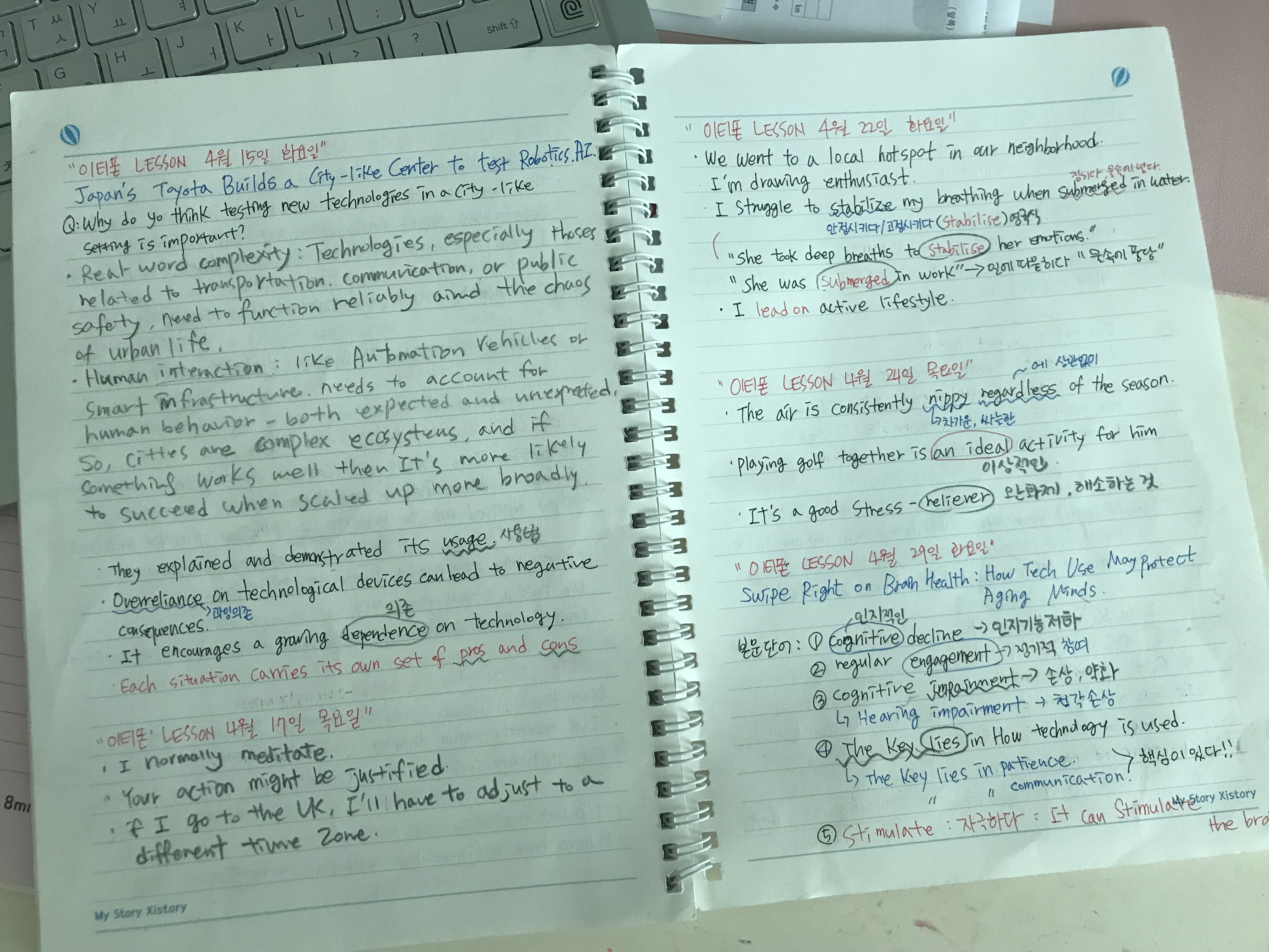 일단 장점부터 말씀드리면, 제 담당선생님의 티칭 스타일이 맘에 든다는 점이에요! 저는 격식있는 표현보다 구어체를 많이 쓰는편이라 문법적으로 틀릴때도 있고 단어 선택에 있어 늘 한정적이었는데 선생님이 제가 쓰는 표현을 고급스럽고 포멀하게 바꿔준다는 점이 좋아요. 스피킹은 문법이 중요하지 않다고 다들 말하지만 저는 문법이 많이 약해서 이 부분을 보완하고 싶은 마음이 있었거든요. 영자신문을 토론하는 수업이라 제가 친구들과 다루지 않는 토픽을 선생님과 이야기하니 자연스럽게 단어량도 늘게 되는 것 같아요. 기존에 아는 단어도 갑자기 생각 안날때가 있어서 선생님이 다시한번 짚어주고 노트에 복습하여 수업중에 공부한 것을 토대로 제가 따로 시간내어서 공부하니 자연스럽게 영어도 느는 것 같아 저는 200% 만족하고 있어요.