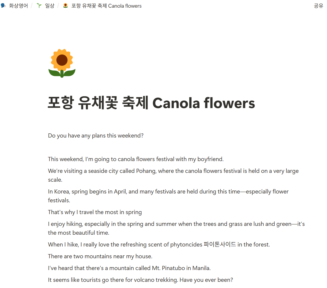 ↓ 미리 연습한 뒤에 수업에 참여하니, 대화할 것들이 많아져서 좋았어요!