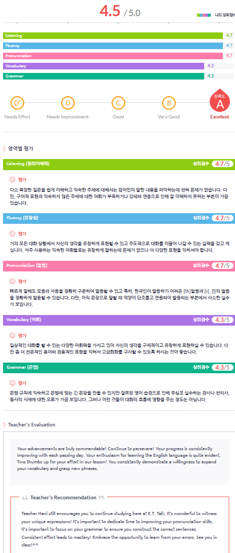 이티폰 수업을 수강한 지 몇 달이 지난 지금, 제 영어 실력에 눈에 띄는 변화가 생긴 것을 느낍니다. 최근 받은 평가 결과에서 평균 4.5점을 받았고, 특히 발음(Pronunciation)과 유창성(Fluency)에서 4.7점이라는 높은 점수를 받아 큰 자신감을 얻었습니다. 단순히 점수가 높은 것뿐만 아니라, 실제 회화에서 문장을 더 자연스럽게 구사하고, 말할 때 머뭇거리는 시간이 줄어든 것을 체감하고 있습니다.