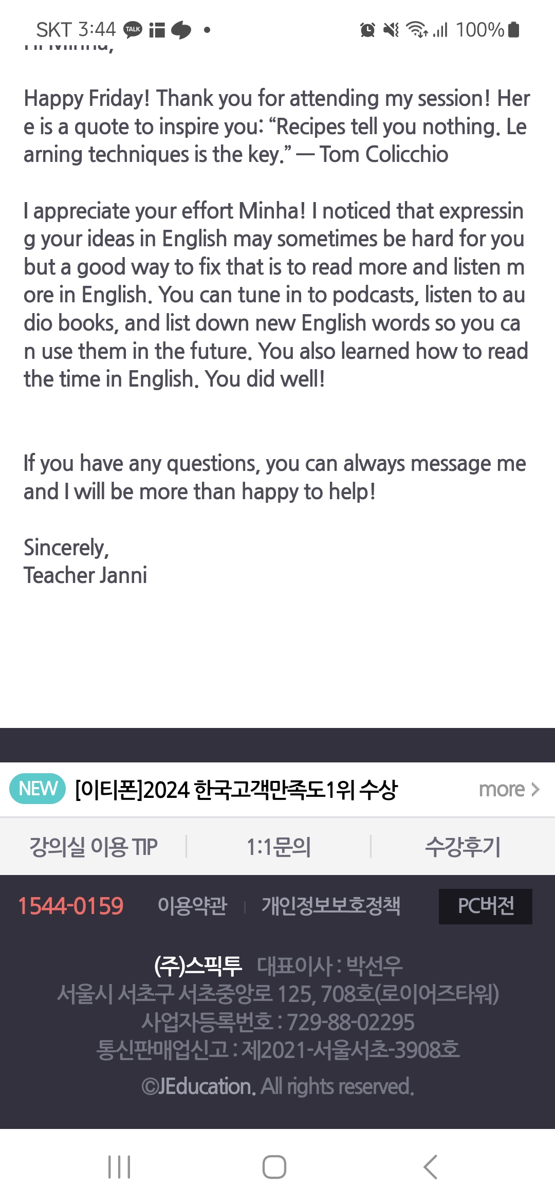 이티폰 시작 한지도 벌써 4개월 차 접어드네요. 시간 변경으로 인해 선생님이 바뀌었습니다. 개인 사정으로 여러 명의 선생님을 만나보았지만 제니 선생님 또한 밝고 큰 성량으로 수업을 잘 이끌어주시네요. 또한 매 피드백마다 명언을 남겨 주시는 데 헛투루 넘겨선 안될 명언들인 것 같아 수업 전 한번씩 읽어보길 권하고 있습니다. 또한 주신 피드 백확인을 잘 하고 있는지 지 수업시작전 확인 요청드렸더니 명언 한줄로도 질문이 한창 오가는 수업을 해주셨습니다. 그런데 선생님 말씀은 알아듣긴 하는 것 같으나 질문에 대한 대답은 아직 발전은 없는 것 같아요.ㅜㅜㅜ당장 아웃풋이 있으면 더할나위 없이 좋겠지만 느리게 라도 발전이 있길 바라며 또 한달 지켜보려 합니다 ㅎ