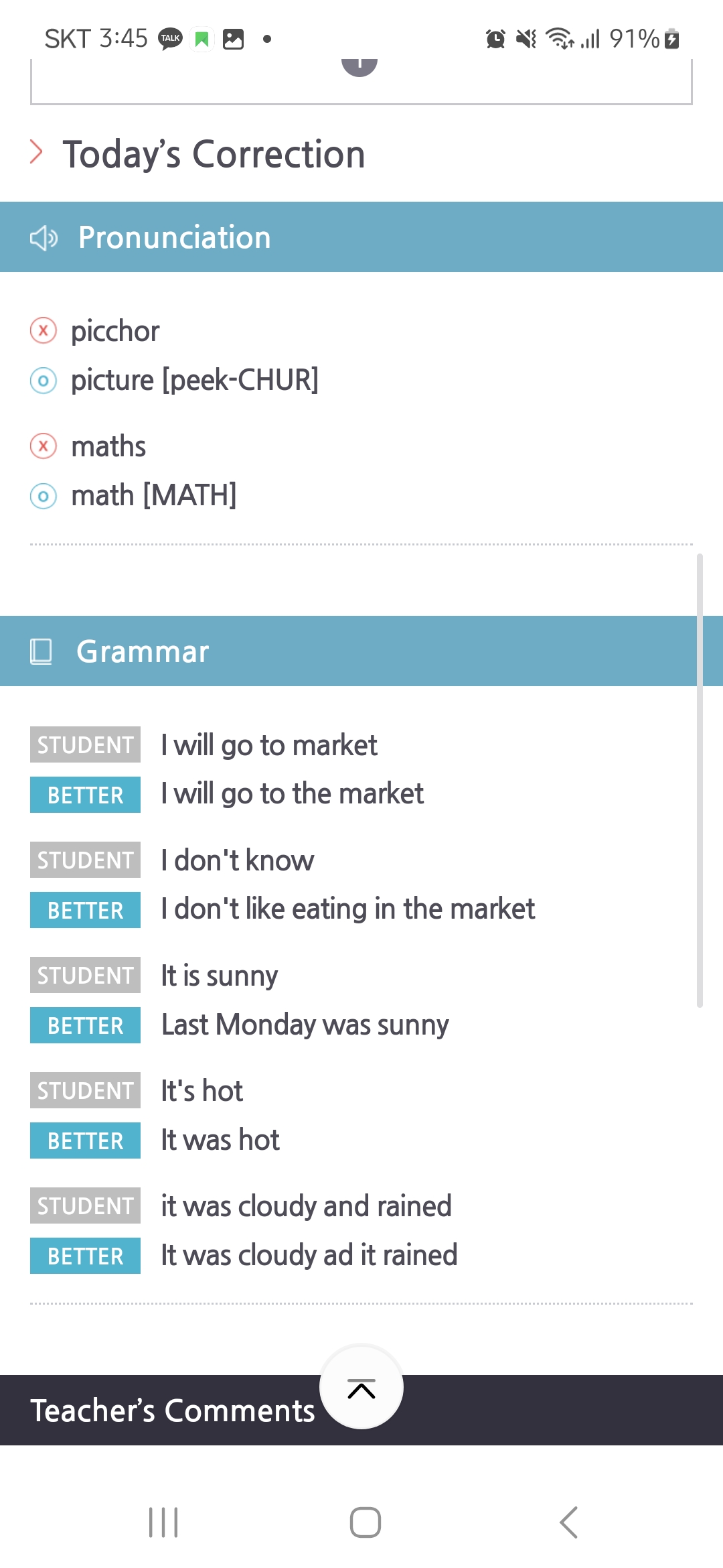 어느덧 4개월 차에 접어들고 있네요..선생님의 말씀은 알아듣긴 하는 것 같으나 그에 비해 자신이 하고 싶은 말을 길게, 완벽하게 전달하지는 못하고 있어 아직 아쉬움이 남는 한 달을 보낸 것 같아요..사실 많은 효과를 보려면 좀 더 엄격하고 규칙적으로 학습 준비를 해야 하지만 엄마 입장에서는 아이에게 부담을 줄이고 즐거운 시간으로 활용하게 하기 위해 푸쉬를 하진 않아요.. 스스로 피드백을 확인하여 틀린 문장 연습해 보기, 문법 확인하기, 모르는 단어 찾아보며 스스로 준비가 되있으면 실력향상에 좋을 것 같아요. 그리고 짧은 문장도 완벽한 문장을 구사하지 못하고 있는데, 배운 문법이라 해도 적용해서 바로바로 말하기엔 아직 어려움이 많은 것 같아요. 그래도 포기하지 않고 계속 이티폰과 함께 하다보면 좋아질 거라 기대해 봅니다. 계속적인 선생님의 꼼꼼한 지도와 문장을 생각해내지 못하거나 단어의 뚯을 몰라 헤매고 있을 때 적당히 기다려 주시는 점이 좋은 것 같아요. 이렇게 하다보면 느리지만 먼저 선생님께 질문하는 날 도 오겠지요?