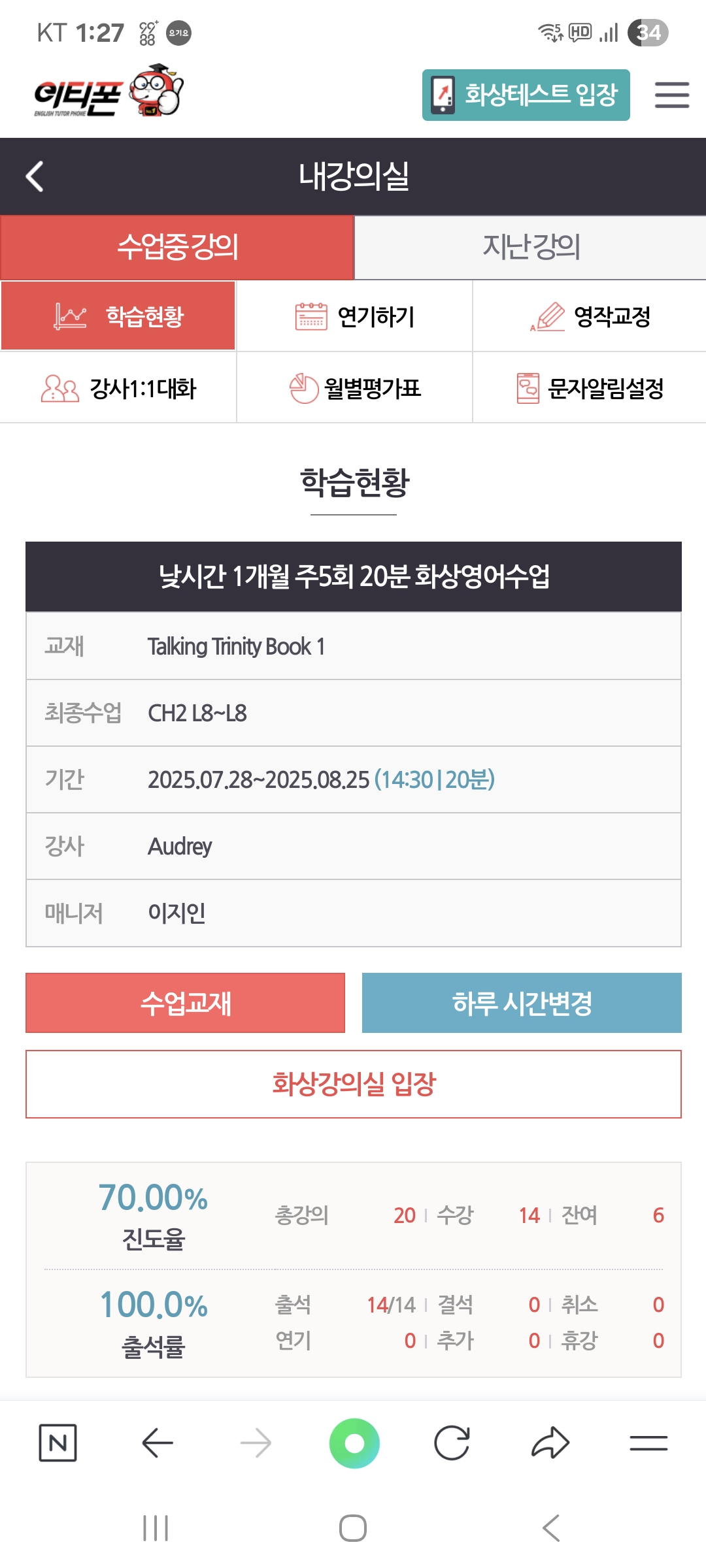 이티폰을 선택하여 시작했습니다 수업 전에 아이가 부끄럽고 걱정되고 하기 싫다고 했지만 첫 수업 후 아이가 손에 땀이나게 긴장한 본인이 민망할 정도로 즐거운 시간을 보냈어요 아이가 선생님의 자연스러운 칭찬 덕분에 용기를 많이내고 수업이 끝나도 너무 행복해 했어요 그래서 저는 이티폰 화상영어에서 가장 만족 스러운