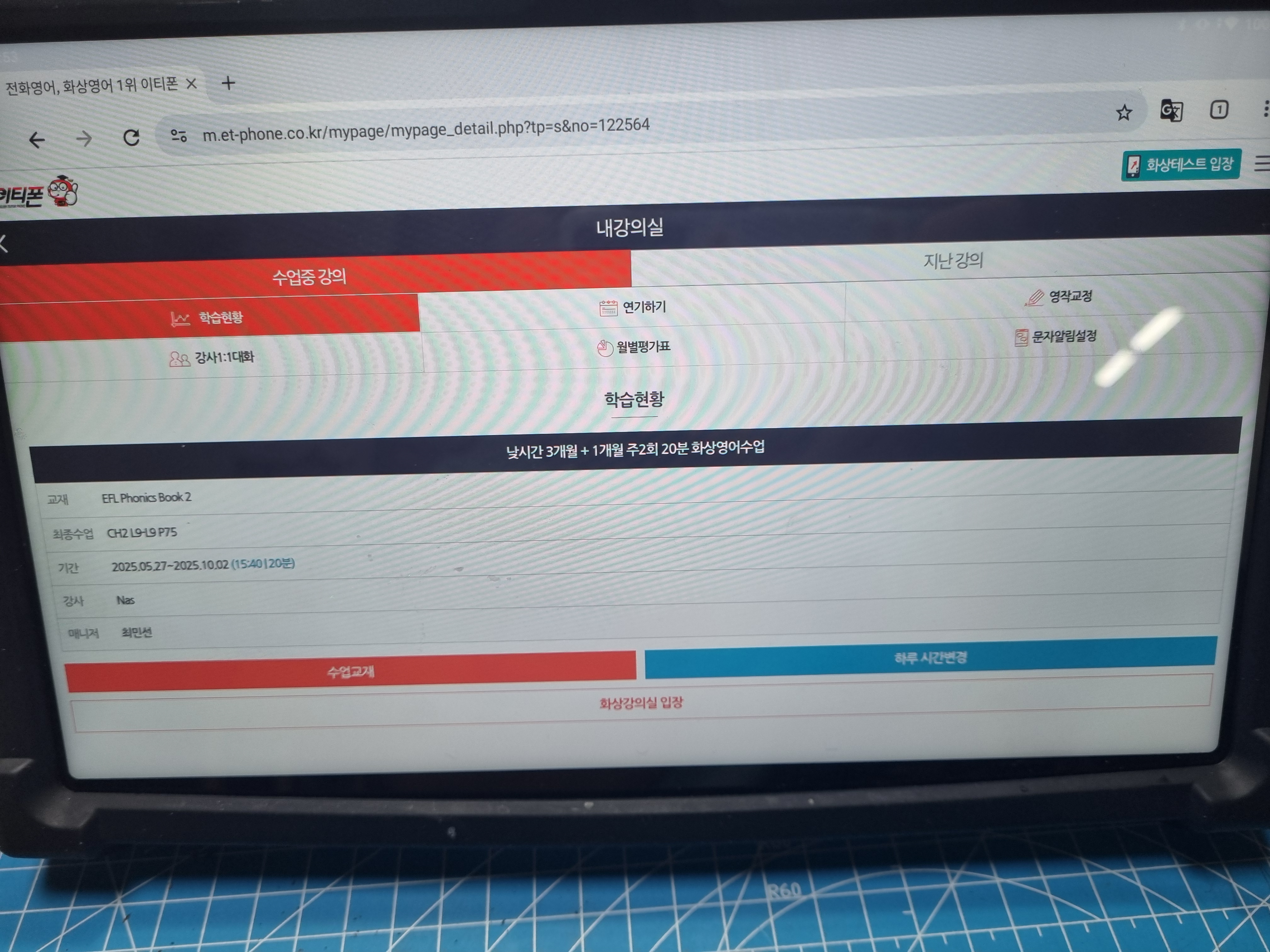 아이는 학원은 아직 안다니고 영유도 안갔어요 . 그냥 파닉스 수업 시작하고 있고 집에서는 따로 or☆책만 읽고 있어요. 낯설어서 선생님 바뀌는것도 힘들었지만 적응하기 다른선생님 바뀌는걸 싫어하네요. 회화 수업은 아니어도 수업 전 ice break 정도 적응하는것도 좋은거 같아요. 처음에는 hello도 못했는데 지금은 파닉스 수업 잘 따라갑니다. 왕기초 이고 efl 파닉스 2권 하니 3개월에 1권 거의 끝나갑니다. 기초 회화 먼저하려니 안되어서 파닉스 부터 시작 합니다. 수준이 안되는데 파닉스도 안되고 단어도 모르고 리스닝도 안되면....영어가 어렵고 힘들어하며 싫어 하게 될까봐 쉬운것부터 시작했어요. 쉬운것부터 하니 자신감도 조금씩 생기고 fluency가 조금은 느는듯 합니다. 언어는 천천히 꾸준히 그리고 자신감도 중요하네요. 성격도 하나의 요소가 되지만... ㅎㅎ 아 특히 교제를 사서 예습 복습 그리고 워크북까지 체크하니 도움이 더 되더라구요. 전화영어는 10분이라 책 안사서 해보니 책이 없다보니 예습 복습도 안되고 효율이 떨어졌어요. 화상영어와 교제 구입 예습. 복습을 추천합니다. 처음에는 답답해요 저거 어제 알려줬는데도 몰라요... 하면 @.@;;; 언제 늘까 싶지만 부모님은 인내심을 가지고 ㅎㅎㅎ 기다리면 될듯 합니다.