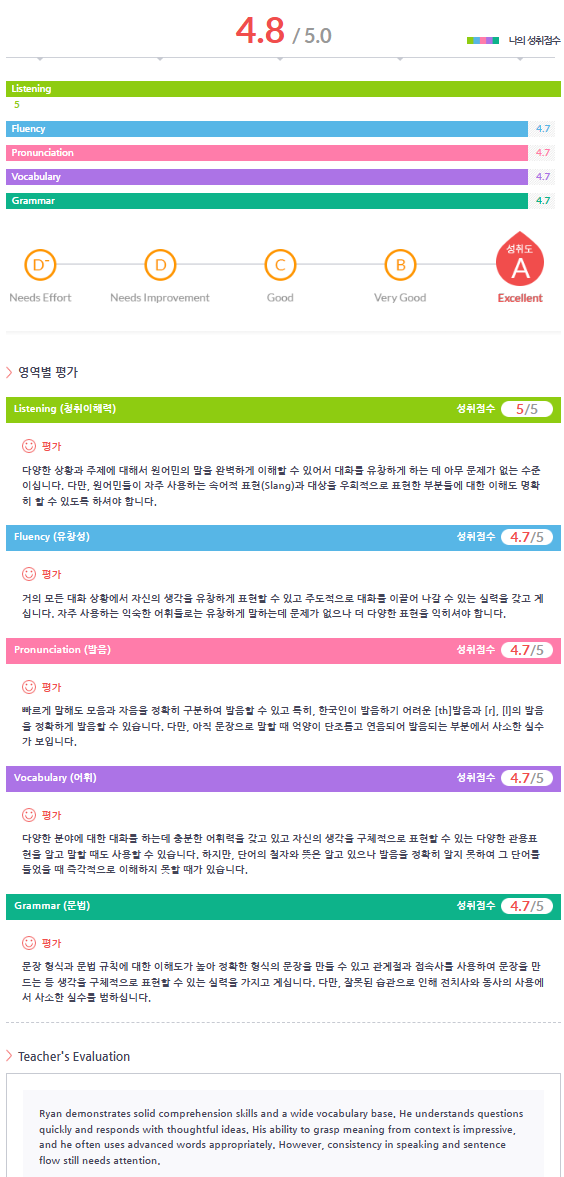 안녕하세요 회원님^^ 처음에는 원어민의 말이 빠르게 느껴지고 문장 만들기가 어려우셨을 수 있지만, 강사님과의 수업을 통해 특히 리스닝에 도움 받으셨다니 저희도 기쁘네요! 무엇보다 회원님이 꾸준히 학습해주신 덕분이라고 생각합니다. 앞으로도 이티폰과 함께 수업 잘 진행하시길 응원하겠습니다! 감사합니다♡