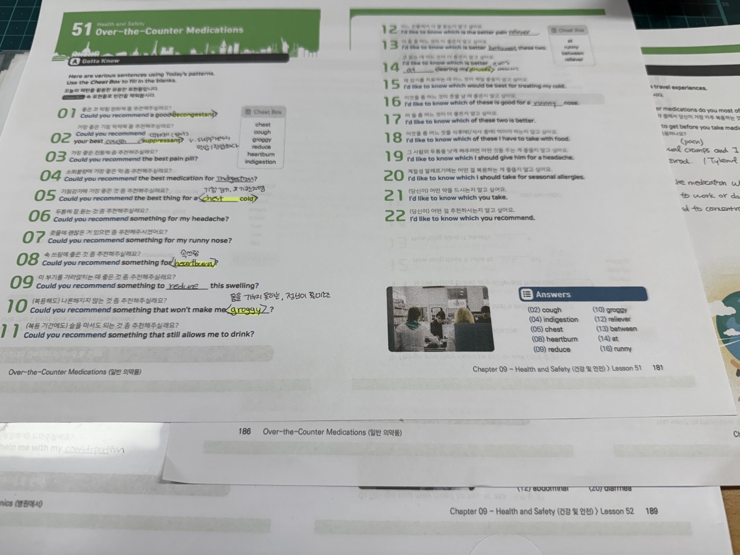 수업 교재도 익숙한 큰 주제 안에서 때로는 낯설고 많이 다뤄보지 않았던 단어와 문장이 나와서 다양한 어휘와 표현을 배울 수 있어 좋았습니다! 이번달에는 여행 중 약국이나 병원, 위험 상황 등에서 사용할 수 있는 내용이 나와서 공부 중인데, 외국에서 사용할 일이 없으면 좋겠지만 알아두면 유용할 것 같습니다.
