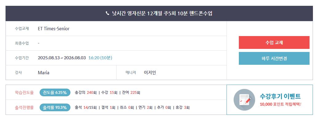 안녕하세요 회원님^^ 오랜기간 동안 이티폰과 함께 해주셔서 감사합니다. Maria 강사님과의 수업을 통해 자신감을 얻으시고 다양한 표현들을 익혀가며 수업 잘 진행해주셔서 감사합니다. 강사님 건강상의 이유로 휴강된 것도 너그럽게 양해해주셔서 감사합니다. 앞으로도 회원님 일정에 맞춰 수업 잘 조정하셔서 꾸준히 수업 이어가시길 응원하겠습니다! 감사합니다♡