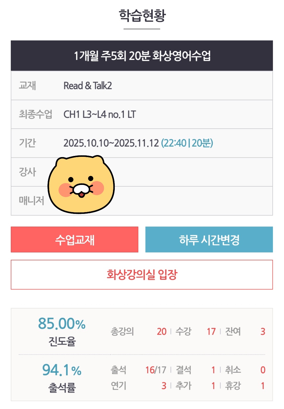 그리고 또 하나 좋았던 점은 수업 시간대가 정말 다양하다는 거예요. 저는 현재 22시 40분~23시에 수업을 듣는데, 다른 일정과 겹치지 않은 시간에 영어수업을 들을 수 있다는 것이 정말 좋았어요. 평소에 근무, 학원, 친구와의 약속 등으로 바쁘다보니 꾸준히 영어를 이어나가기 쉽지 않은데, 이렇게 늦은 저녁 시간에도 수업이 가능하니까 포기하지 않고 꾸준히 학습할 수 있었습니다!!