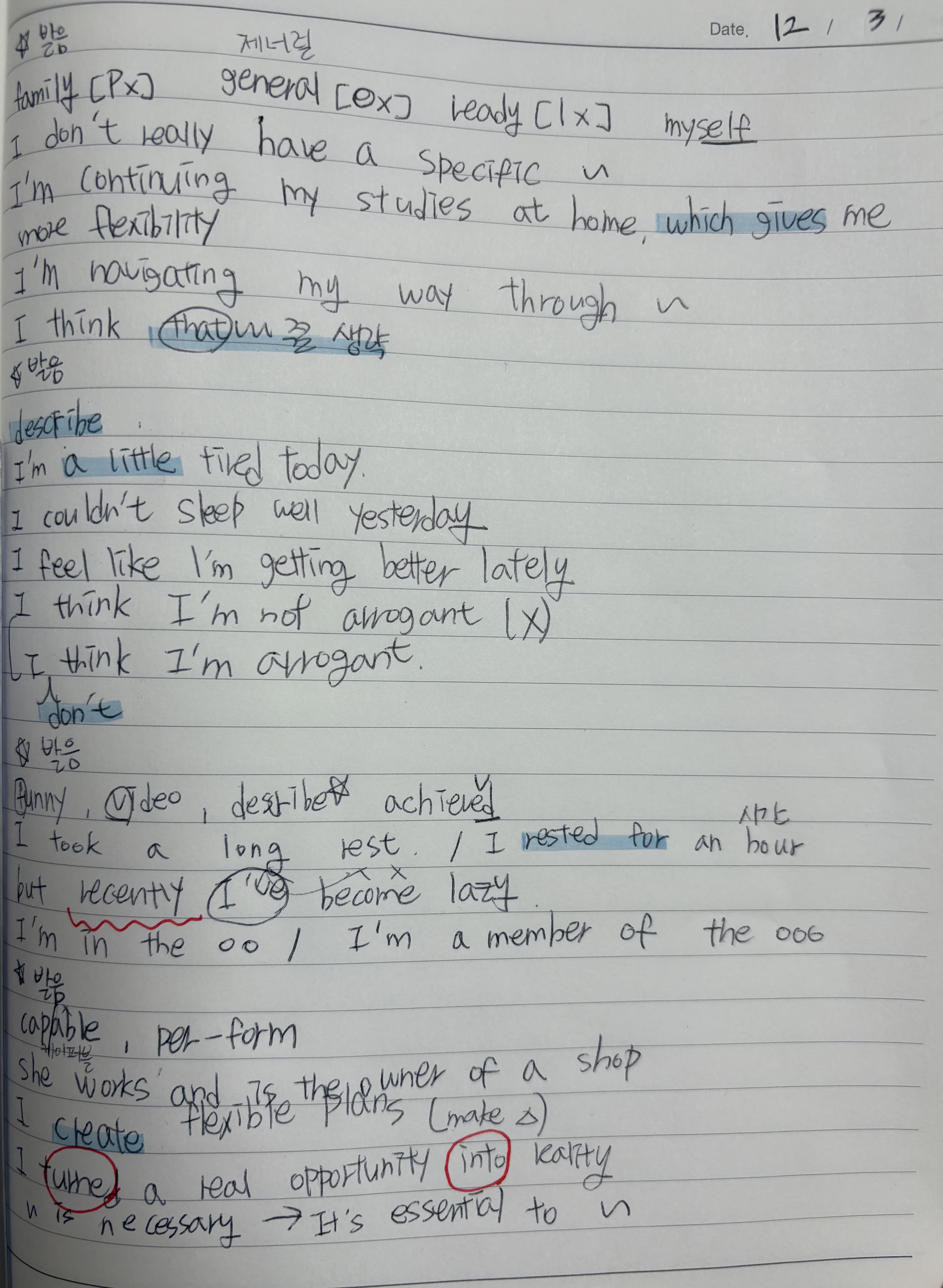 아직은 영어로 대답을 제시하는데 있어서 문장 연결이 자연스럽게 안돼서 단어 마디로 끊기긴합니다. 선생님과 대화하는 중에 길게 대답하거나 호응하고 싶은 내용이 많았는데 갑자기 어휘가 생각 안 나서 제대로 답변 못 한 것들이 많은게 아쉬웠어요 앞으로 대화가 잘 이어지도록 유창성을 키우고 싶어요~