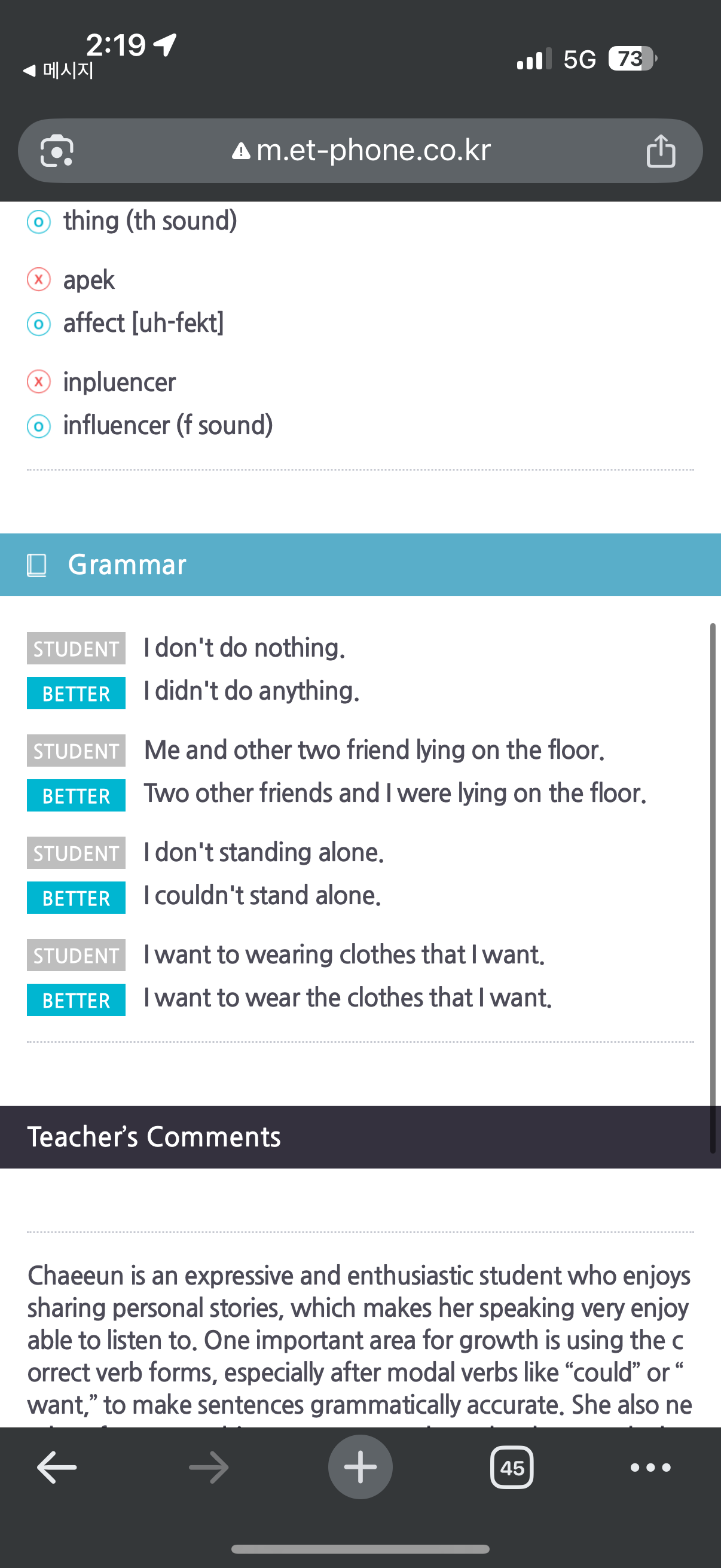 하지만 이티폰 화상영어를 시작하면서 화상영어에 대한 생각이 완 전히 달라졌습니다. 문법이 완벽하지 않더라도 제가 전달하고 싶은 내용은 충분히 말할 수 있게 되었고 선생님께서 제 말을 끝까 지 들어주신 뒤 자연스럽게 표현을 고쳐주셔서 부담 없이 수업에 참여할 수 있었습니다. 그 덕분에 틀리는 것에 대한 두려움이 줄었 고 영어로 말하는 시간이 점점 편해졌습니다.